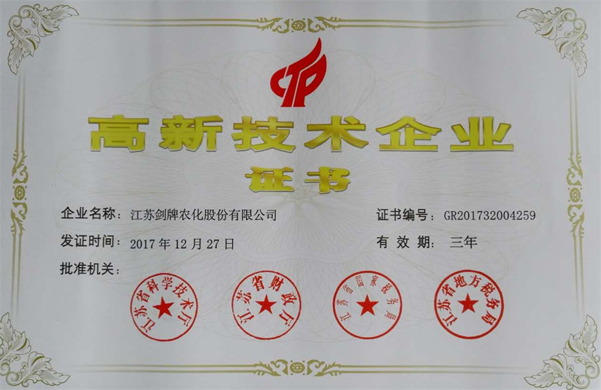 ·During the period of“ninth-five-year-program of China”, the triazole series of optical pesticide research project (Developed in cooperation with Nanjing Agricultural College), was awarded the First-class Science and Technology Progress Award of Jiangsu province, National invention prize (Third-class). Self-developed project——20t/a P—type Uniconazole, was awarded the certificate of National Key New Product by State Economic and Trade Commission.