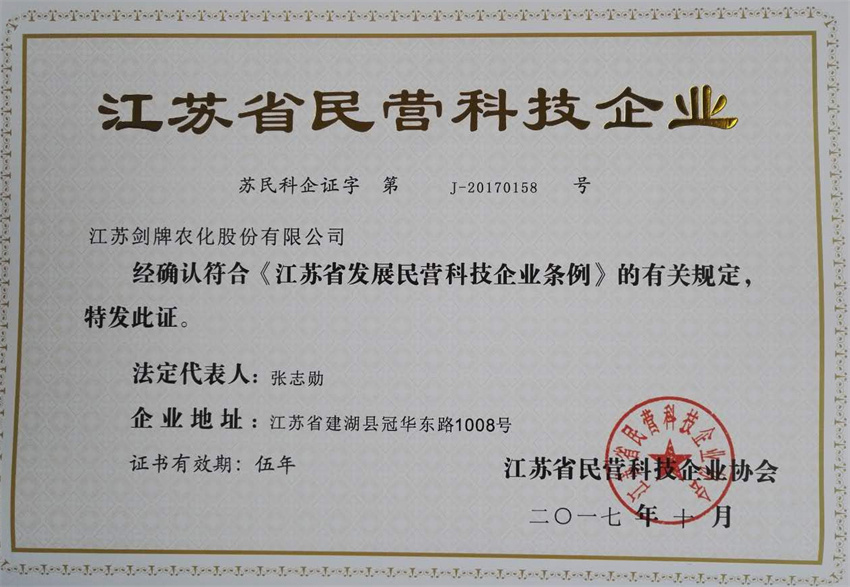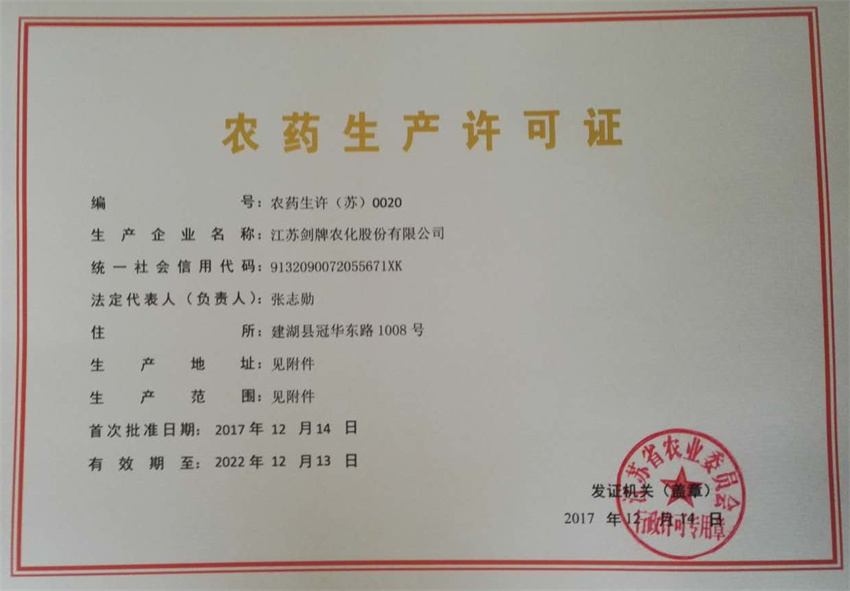 ·During the period of“tenth-five-year-program of China”, we were approved as the research and developer of key technical projects of Jiangsu province for "three-pesticide"——50t/a A-type Triadimenol, which passed the pilot identification and project authentication sponsored by Bureau of Science and Technology of Jiangsu province, this product was listed into Torch program of Ministry of Science and Technology,National Key New Product. Self-developed project---200t/a (100%) Asulam, which passed the pilot identification sponsored by Bureau of Science and Technology of Jiangsu province, was awarded the certificate of National Key New Product by Ministry of Science and Technology .